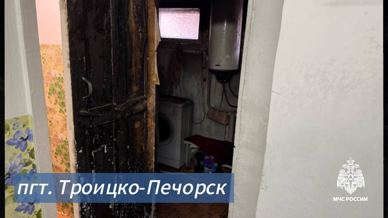 пгт. Троицко-Печорск, возгорание в квартире двухэтажного жилого дома по улице Савина ликвидировано на площади 2 квадратных метра. Эвакуированы 7 человек. Предварительная причина пожара – нарушение требований пожарной безопасности при эксплуатации отопительной печи.