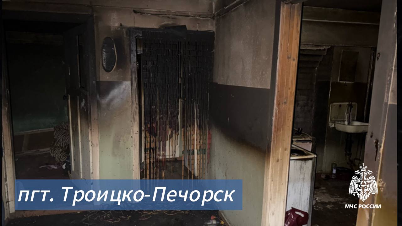 пгт.Троицко-Печорск, возгорание в квартире двухэтажного жилого дома по улице Савина ликвидировано на площади 20 квадратных метров. Звеньями газодымозащиптной службы спасены 5 человек, в том числе двое несовершеннолетних детей. Эвакуированы 17 человек. Травмирован 55-летний мужчина. Предварительная причина пожара – неосторожность при курении.