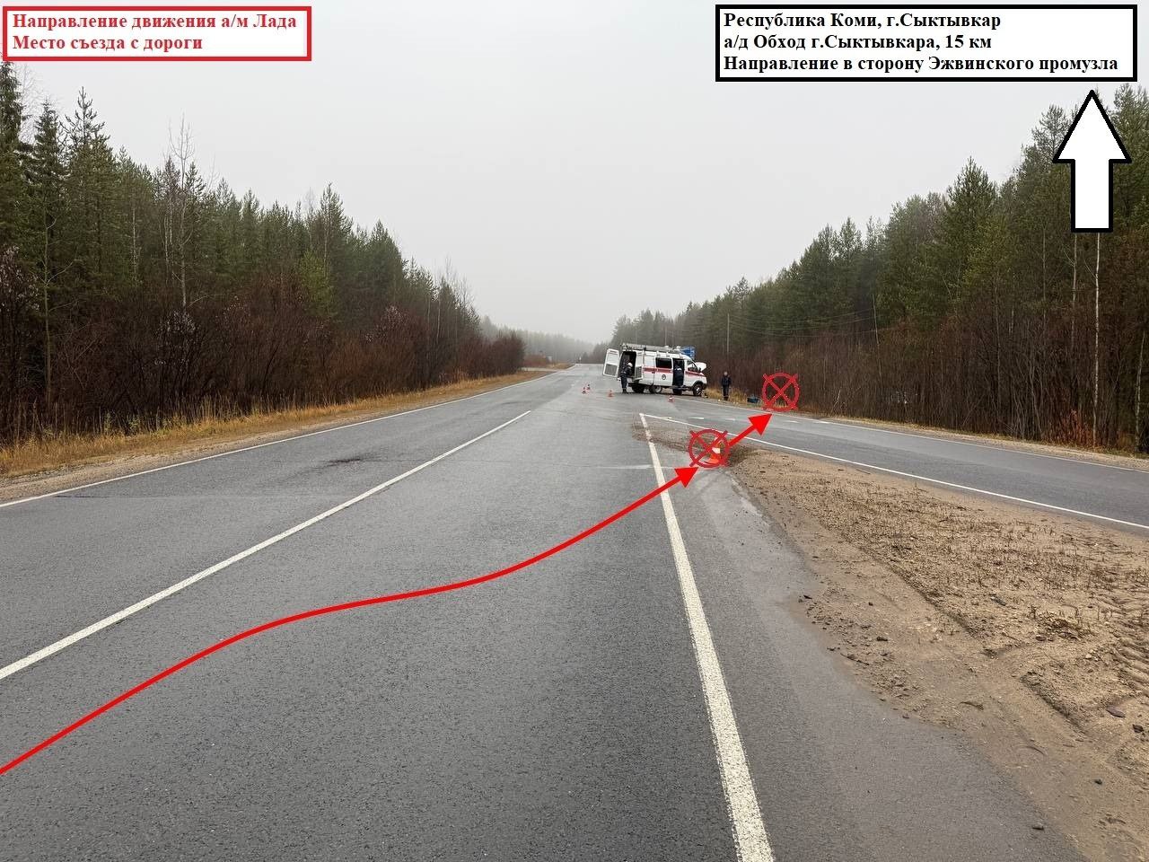 24.10.2025 около 07:45 водитель, управляя автомашиной "Лада", двигаясь по автодороге "Обход г. Сыктывкара", не справился с рулевым управлением, в результате чего совершил съезд с дороги в правый по ходу движения кювет с последующим опрокидыванием.