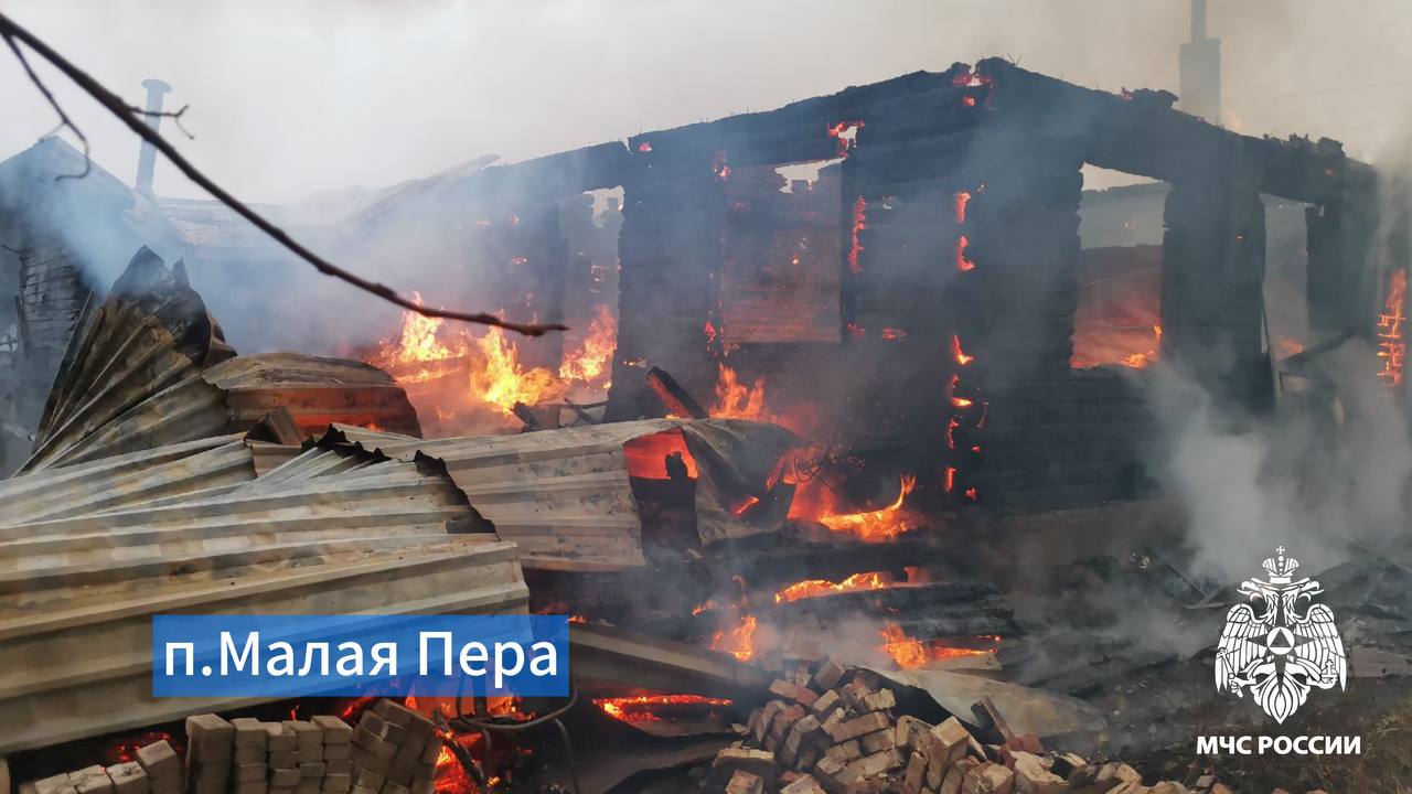 п.Малая Пера, пожар в частном жилом доме, бане и хозпостройках, по улице Северная ликвидирован на площади общей 328 квадратных метров. В результате пожара погиб 70-летний мужчина. 2 жильца дома эвакуированы.