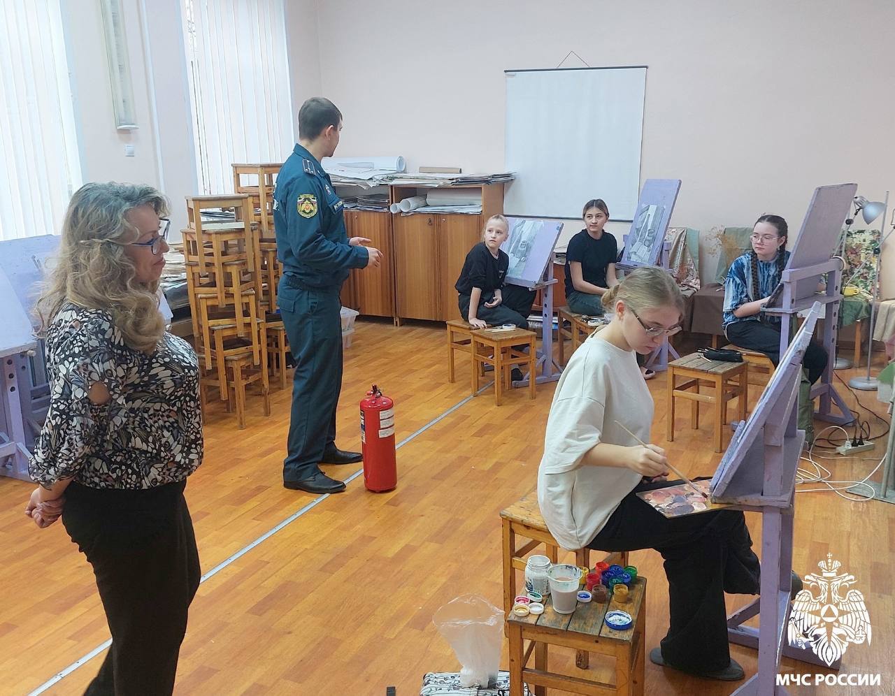 Вместо кистей и красок на повестке дня - огнетушитель! Инспектор МЧС России Иван Черненко провёл для юных художников важный и познавательный урок. Ребята узнали как устроен и работает огнетушитель.
