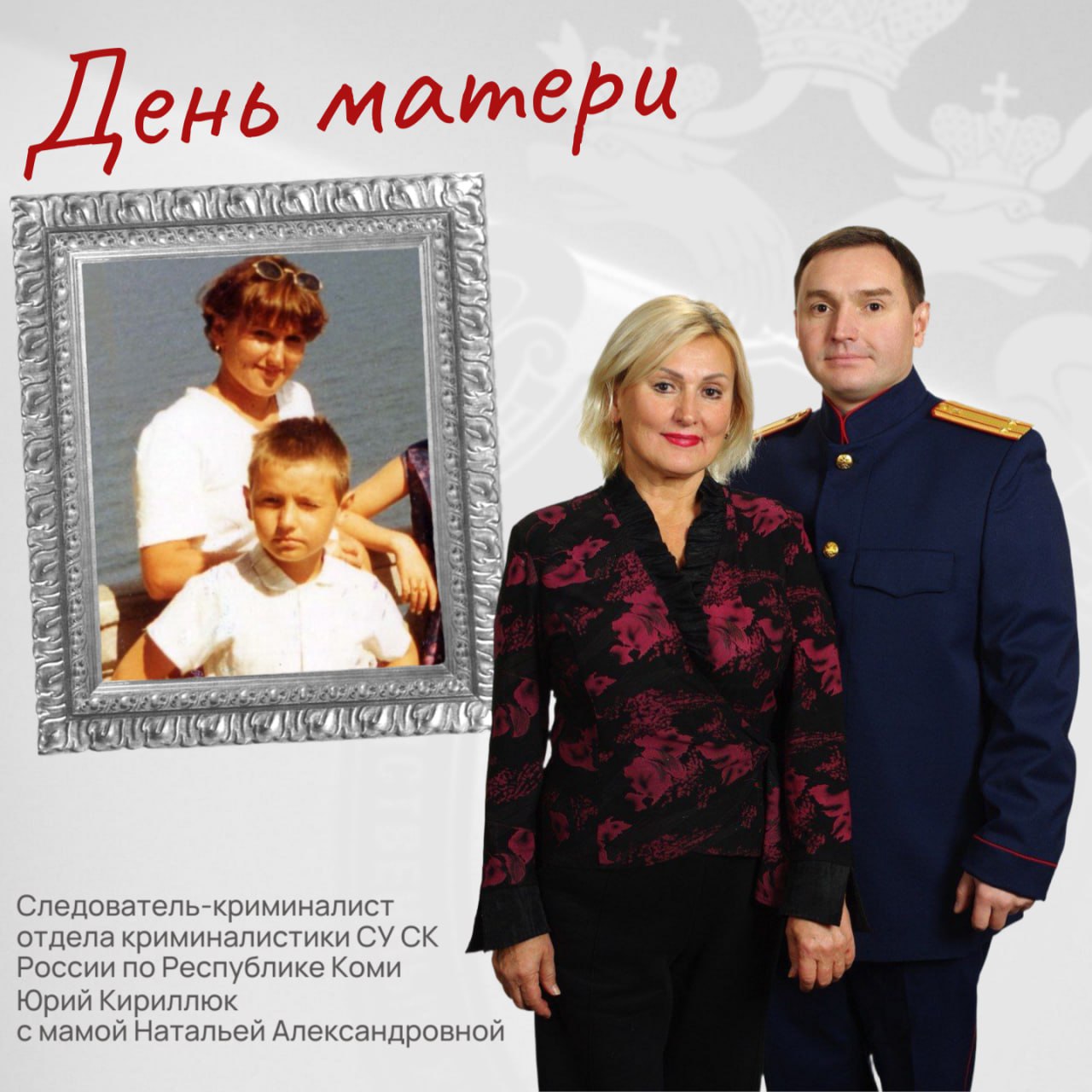 В проекте «Расскажи о маме» принимает участие следователь-криминалист отдела криминалистики СУ СК России по Республике Коми Юрий Кирилюк: "Мама - самый близкий и важный человек в жизни каждого человека. Моя мама с детства является для меня нравственным ориентиром и наставником. Меня и сестру она воспитывала личным примером в атмосфере доверия.Будучи по профессии юристом, учила быть целеустремленными, верить в себя и никогда не сдаваться. Прививала честность, трудолюбие и ответственность за порученное дело. Сейчас мама на заслуженном отдыхе. Она искренне интересуется нашими успехами, проблемами, много времени уделяет внукам. От всего сердца хочу поблагодарить мою маму за любовь и заботу, жизненные уроки, а также поддержку и веру в меня".