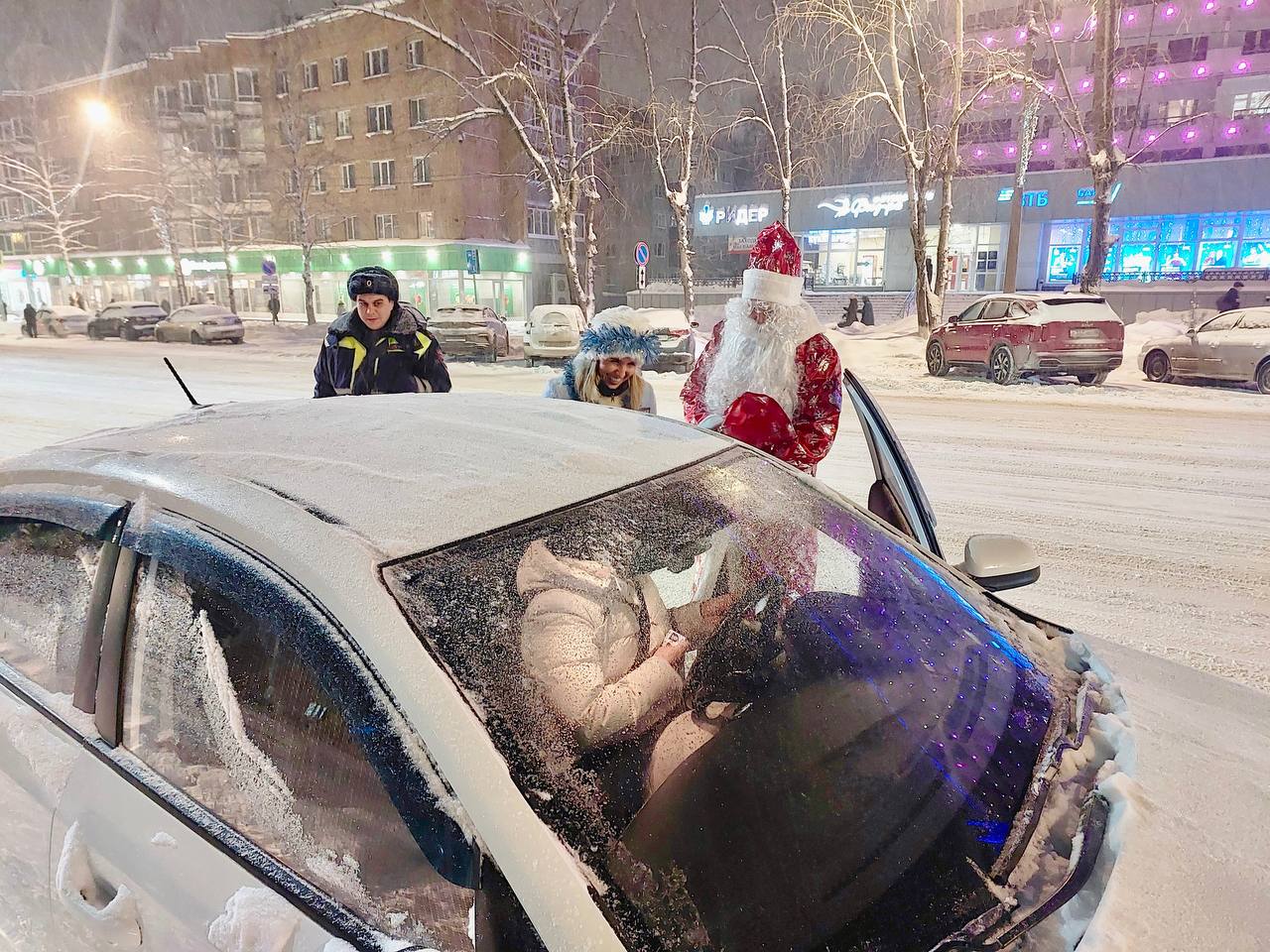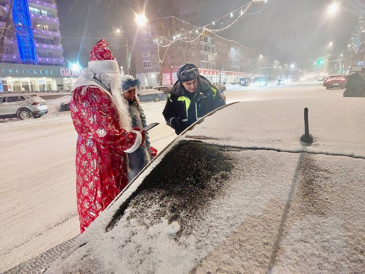 Инспекторы ДПС останавливали автомобили, а их помощники – Дед Мороз и Снегурочка – поздравляли водителей с приближающимися Новым годом и Рождеством. В ходе беседы автоинспекторы и сказочные персонажи напоминали о необходимости соблюдения скоростного режима, использования ремней безопасности и безусловного отказа от управления транспортным средством в состоянии опьянения