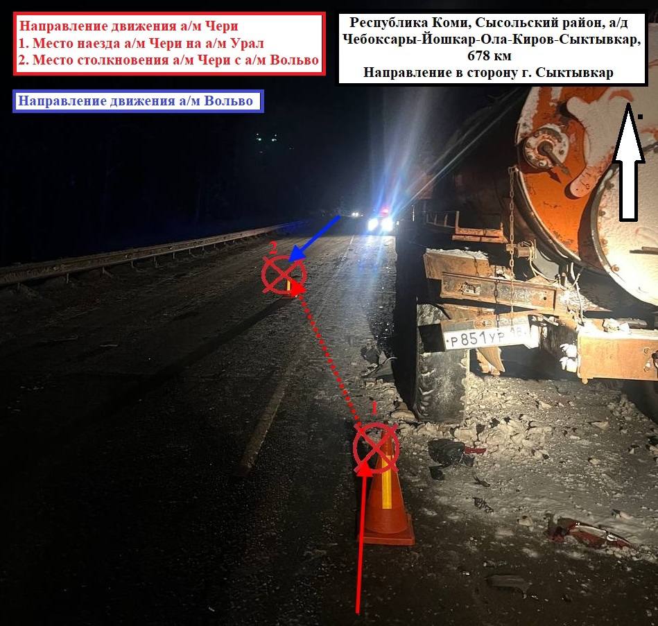 29.01.2026 около 18:30 водитель, управляя автомашиной Чери, двигаясь по автодороге Чебоксары Йошкар-Ола Киров Сыктывкар, уходя от столкновения с автомашиной Урал, которая стояла на проезжей части, выехал на сторону дороги предназначенную для встречного движения, в результате чего совершил столкновение с автомашиной Урал, после чего автомашина Чери совершила столкновение с автомашиной Вольво.