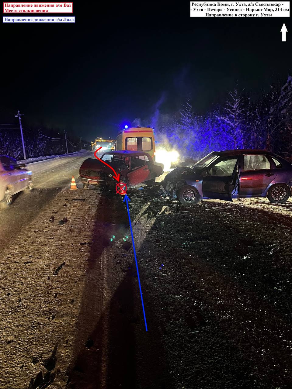 30.01.2026 около 18:00 водитель, управляя автомашиной ВАЗ, двигаясь по автодороге Сыктывкар - Ухта - Печора - Усинск - Нарьян-Мар, не справился с управлением, выехал на сторону дороги предназначенную для встречного движения, в результате чего совершил столкновение с автомашиной Лада.