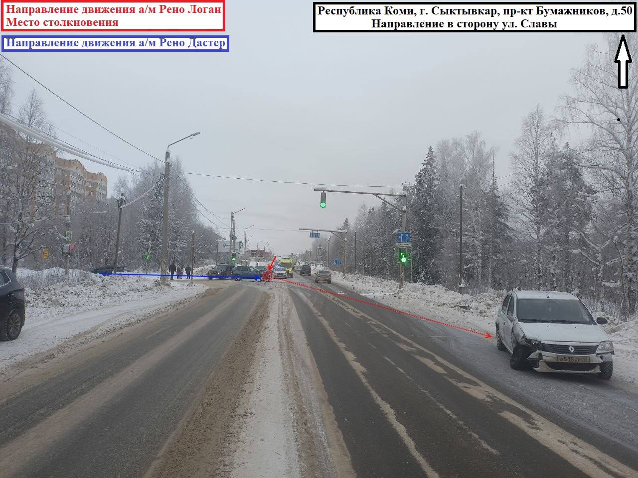 30.01.2026 около 09:32 водитель, управляя автомашиной Рено, двигаясь по пр-ту Бумажников, проезжая регулируемый перекресток. ул. Весенняя и пр-та Бумажников на запрещающий (красный) сигнал светофора, совершил столкновение с автомашиной Рено, которая двигалась по ул. Весенней на разрешающий (зеленый) сигнал светофора.