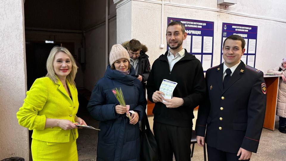 Мужчины — сотрудники полиции и общественник — встречали каждую посетительницу, которая обратилась в Отдел по вопросам миграции за получением государственных услуг цветами. Яркие весенние тюльпаны стали символическим подарком для всех женщин, пришедших в этот день в ведомство.