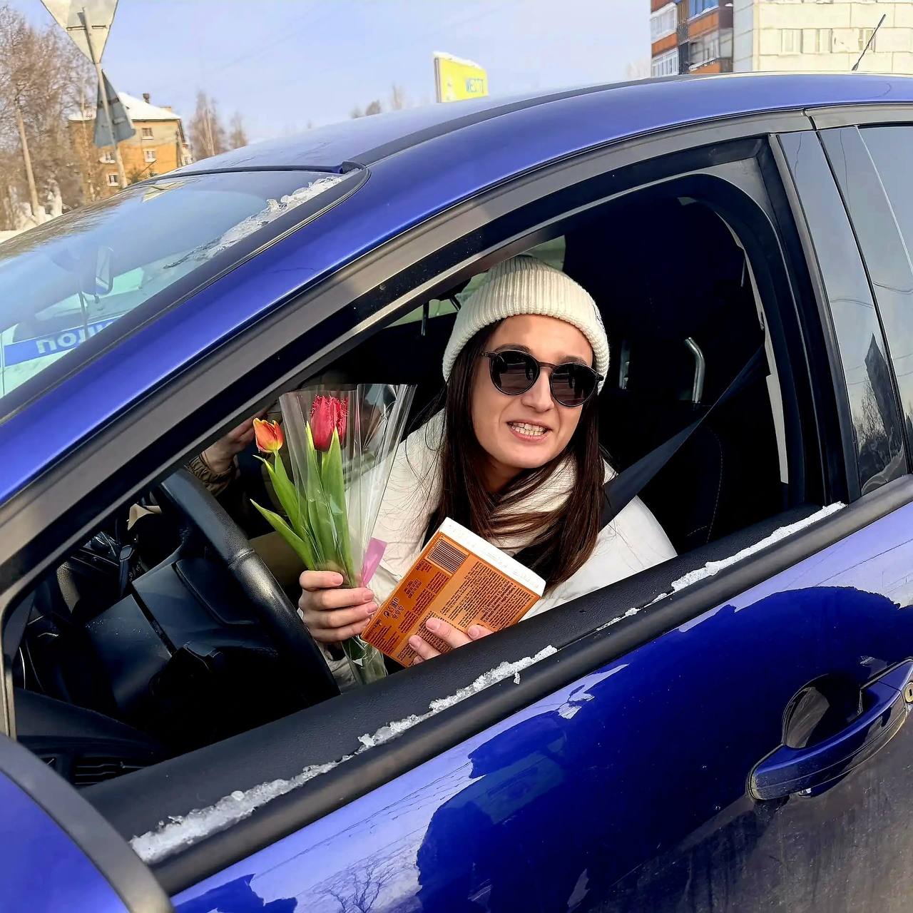 Юные кадеты поздравляли дам и вручали женщинам - водителям яркие и долгожданные весенние тюльпаны. Автоледи благодарили сотрудников полиции и кадетов за прекрасный подарок и с радостью фотографировались с ребятами.