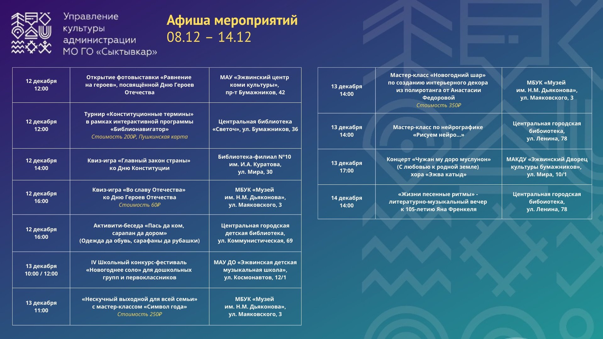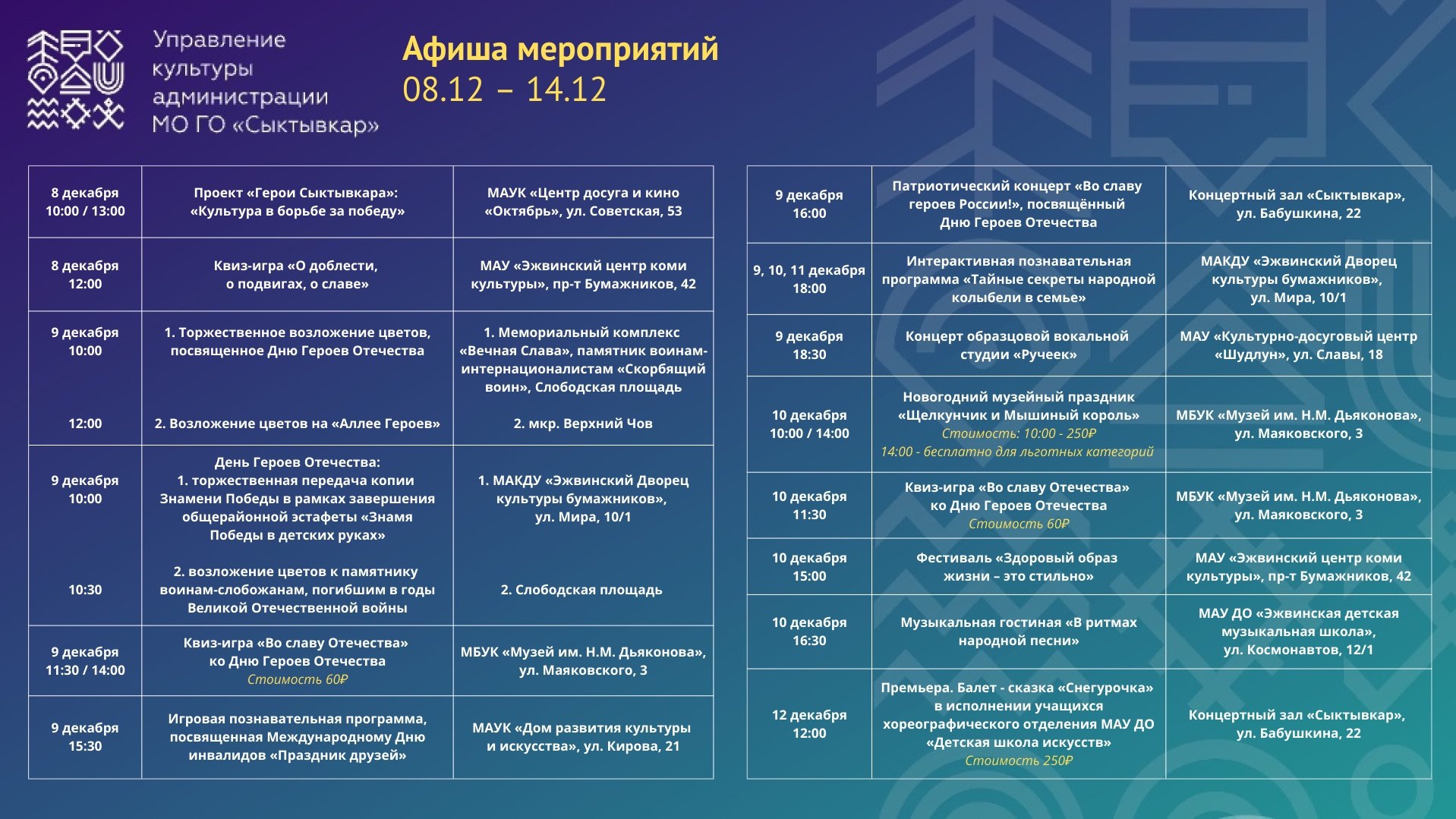 Афиша культурных мероприятий с 8 по 14 декабря