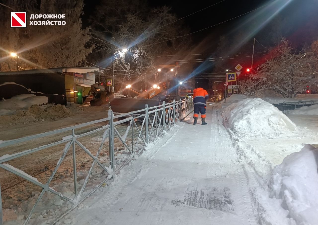 За ночную смену вывезен снег с Нагорного проезда, улиц Юхнина, Катаева (от ул. Старовского до в/ч, д. 39,47 - стоянки для инвалидов), Красных Партизан (от Октябрьского пр. до ул. Интернациональной) - 1 сторона, Октябрьского проспекта (от ул. Орджоникидзе до ул. Чкалова) - 1 сторона, Кирульского переулка, улиц Мичурина, Заводской (от ул. Савина до м. Красная гора) и Савина.