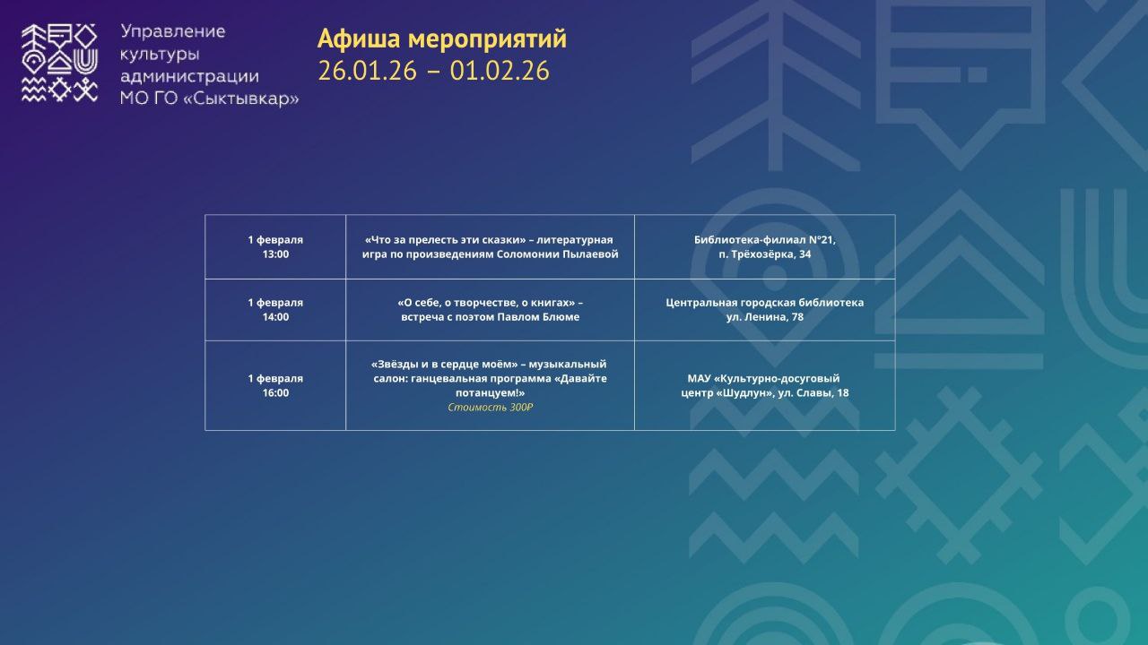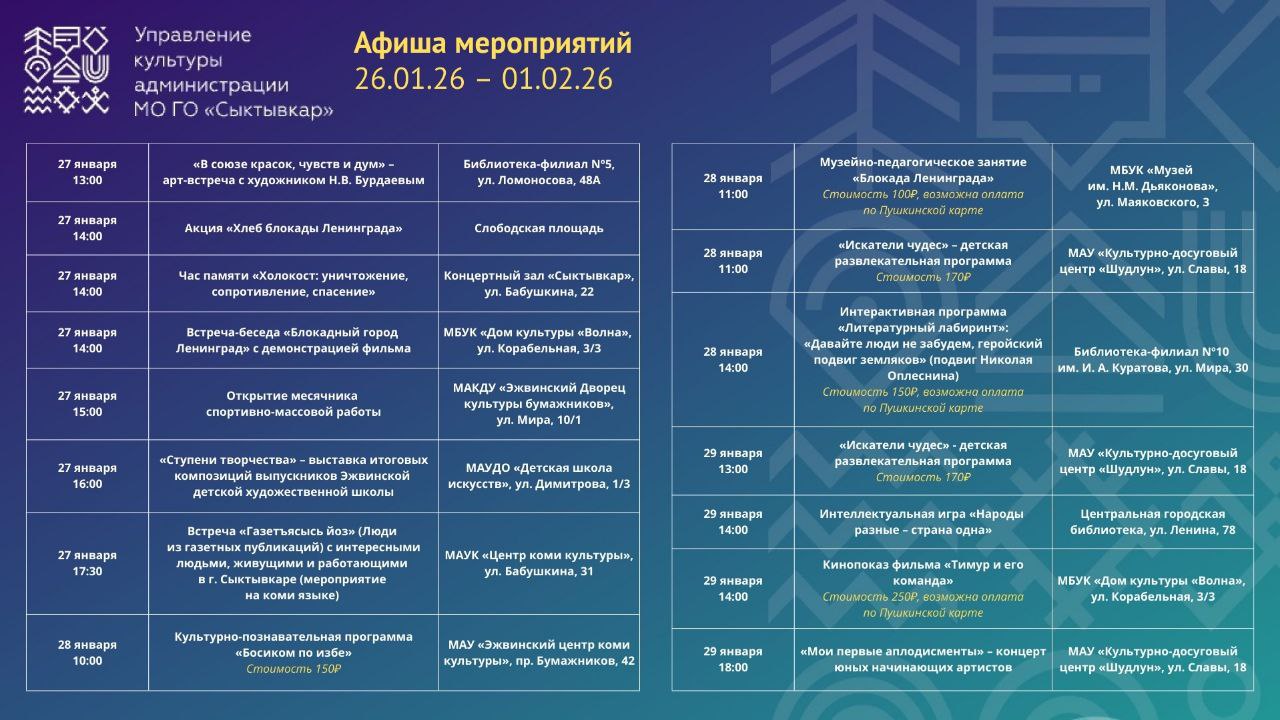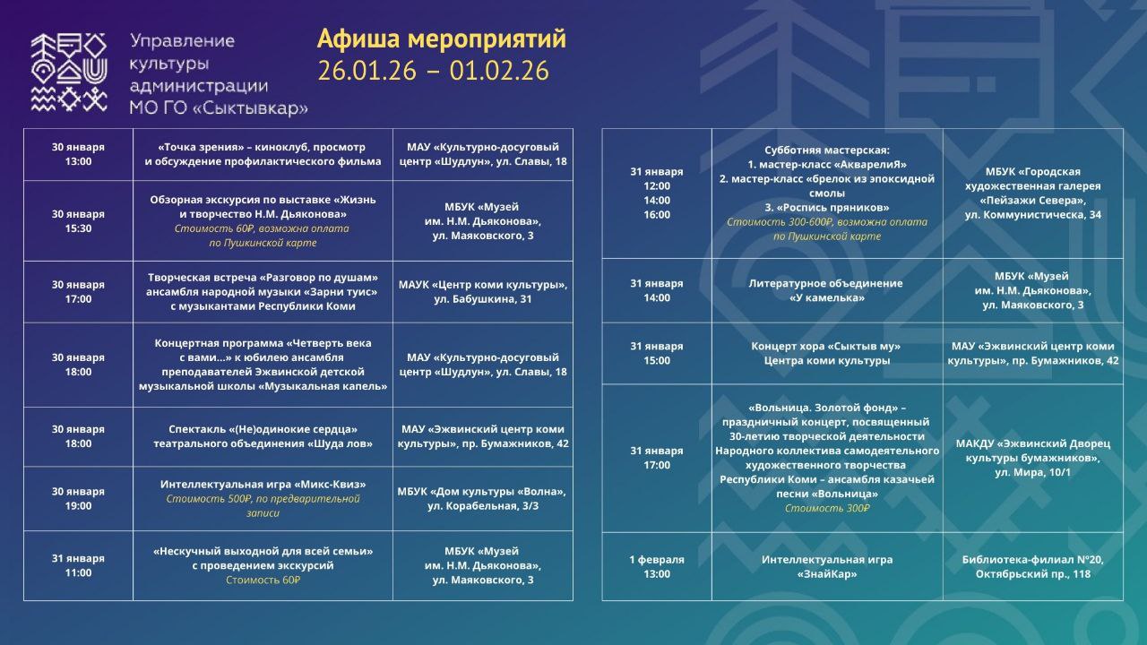 Сыктывкар продолжает радовать насыщенной культурной жизнью!Январь вот-вот завершится, успевайте провести эти дни с родными в особой атмосфере наших городских мероприятий. Все они подготовлены для вас!