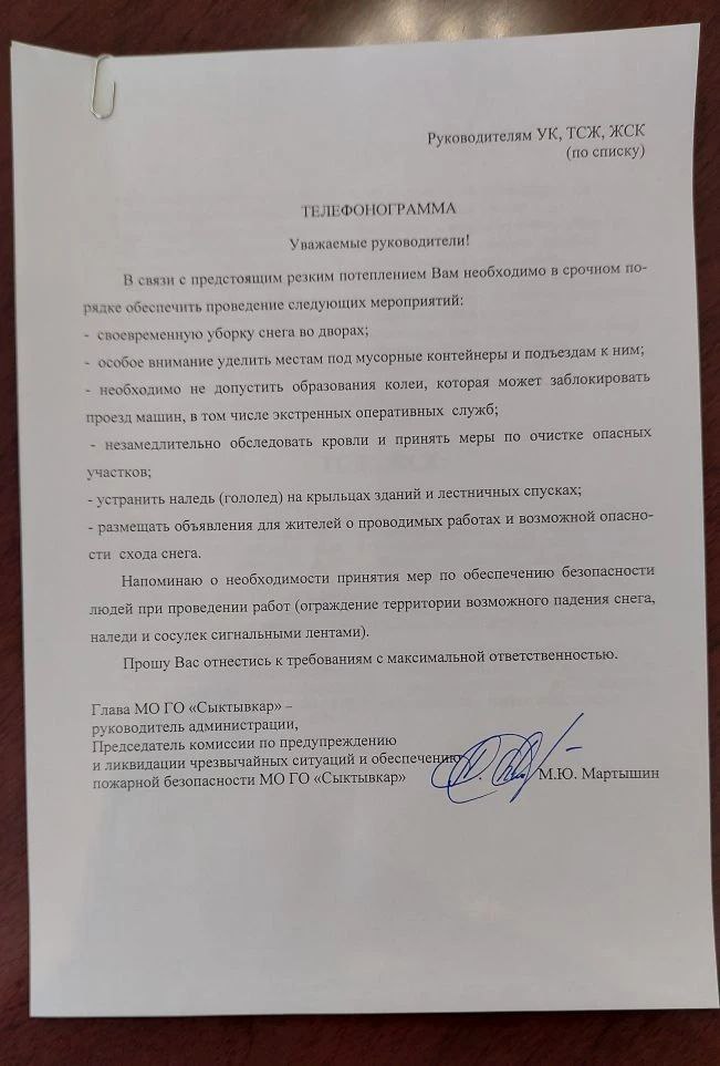 Как и сообщал ранее, направили через Управление по делам ГО и ЧС Сыктывкара телефонограмму всем руководителям управляющих компаний с требованием своевременно убрать дворы.