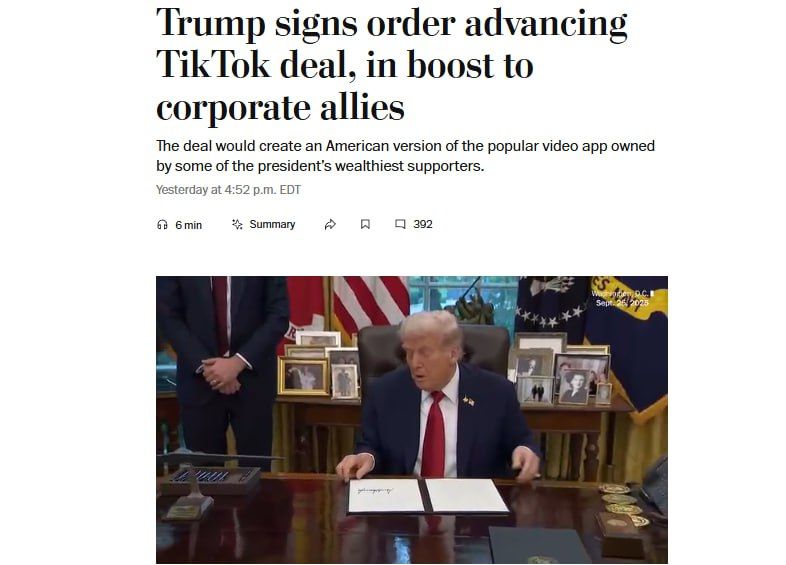 Сделка по TikTok Зарубежные издания обсуждали новость о том, что Трамп подписал указ о сделке по продаже TikTok американским инвесторам. Теперь китайской компании ByteDance будет принадлежать менее 20% акций американского подразделения соцсети.New...