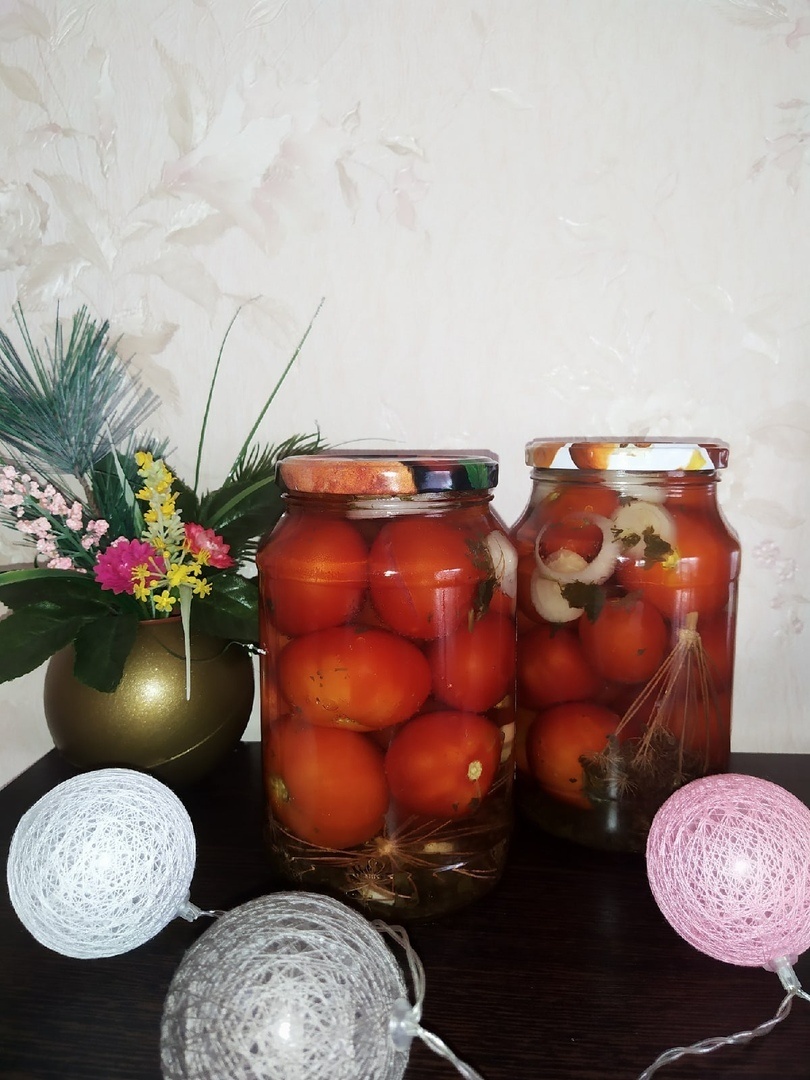 В отдельной кастрюле доводят до кипения очищенную воду, добавляют все ингредиенты для рассола и варят в течение 10 минут. После этого вливают стакан уксуса и продолжают варить ещё 2 минуты. Получивший рассол заливается в банки с помидорами, после чего их накрывают крышками без закатывания.