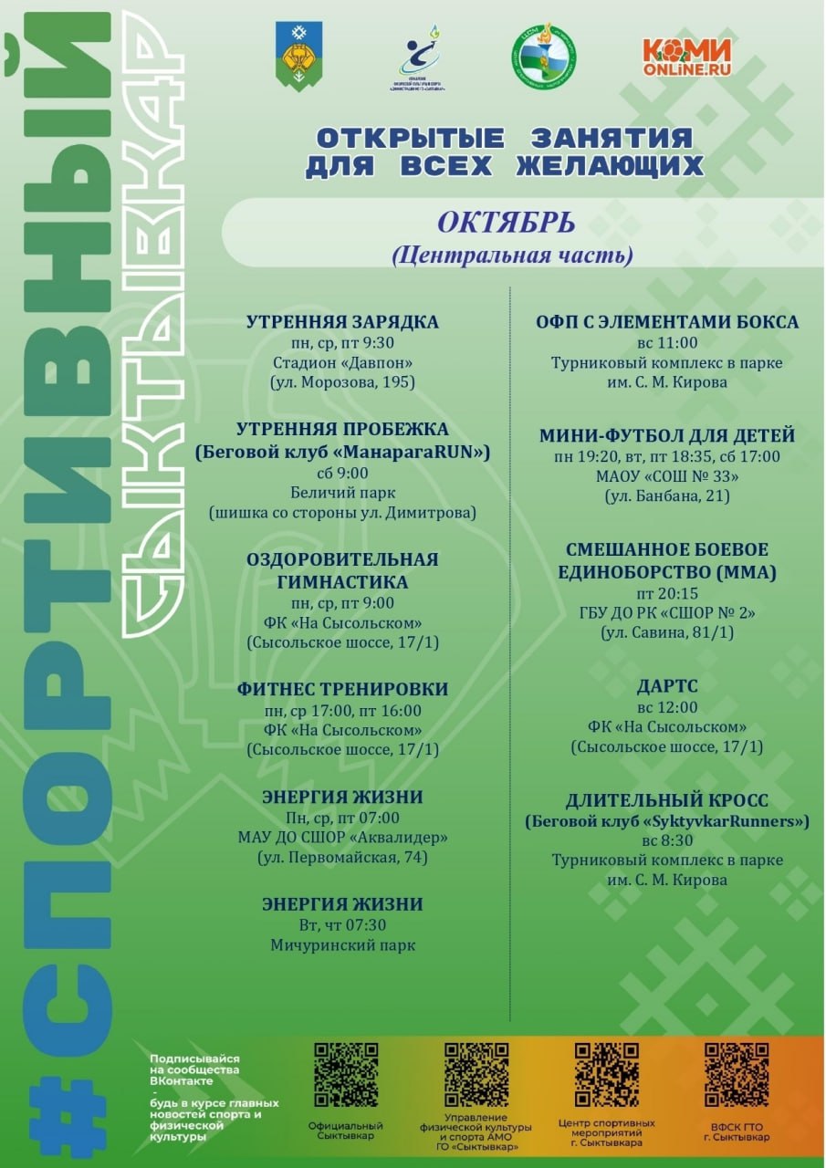 Центр спортивных мероприятий Сыктывкара продолжает проводить бесплатные занятия для всех желающих на спортивных площадках Сыктывкара, Эжвинского района и сыктывкарских поселков.