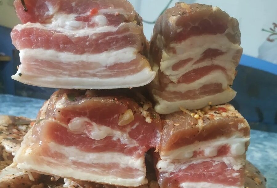 - Классический способ с варкой: Этот метод вообще не требует особых навыков и дорогостоящих ингредиентов. Кусок сала следует тщательно промыть, положить в кастрюлю, залить водой и довести до кипения. Кипятить нужно не более 10 минут. После готовки сало остужается, и его следует обвалять в специях. Такой подход позволит не только вернуть вкус, но и сделать мясо более мягким.