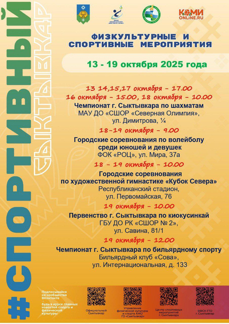 С 13 по 19 октября в Сыктывкаре пройдут насыщенные физкультурные и спортивные мероприятия: шахматы, волейбол, художественная гимнастика, киокусинкай, бильярд.