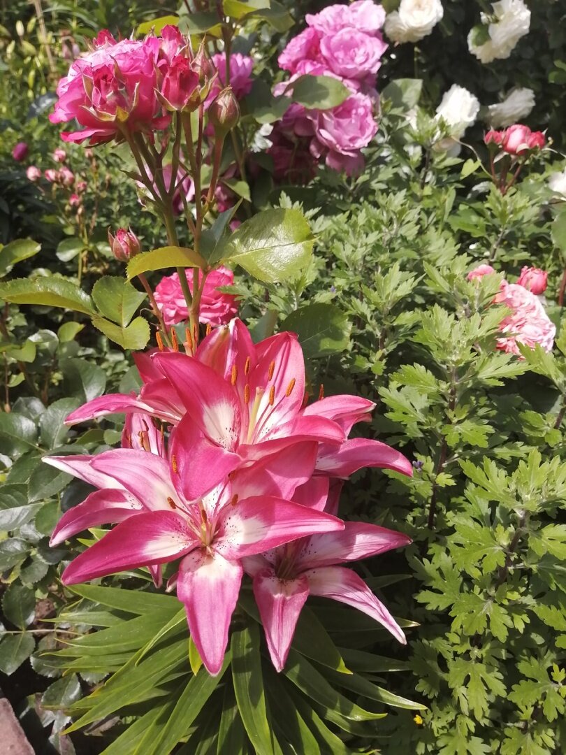 - Большой розарий: Цветение роз продолжается и сочетается с пышными лилиями, создавая незабываемый ароматный коктейль.