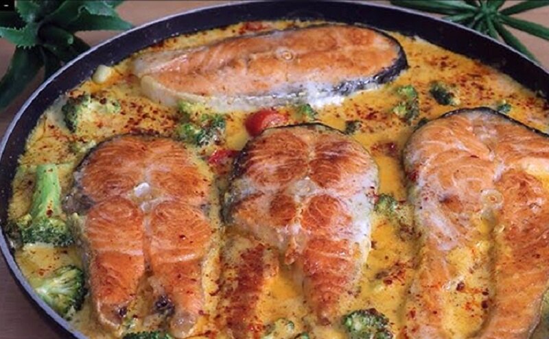Затем стоит добавить оставшиеся зубчики чеснока и нарезанные сладкие перцы, обжаривая их 2-3 минуты. Переходите к муке: добавляйте ее постепенно, помешивая, чтобы избежать комков. Наблюдайте за тем, как мука обжаривается до золотистого цвета, и пора добавлять специи. Влейте 400 мл сливок и 200 мл воды, не забудьте посолить и поперчить по вкусу. Доведите до кипения и аккуратно опустите в смесь соцветия брокколи. Варите 2-3 минуты, после чего верните на сковороду обжаренные стейки лосося. Перед подачей присыпьте все свежей зеленью и молотым красным перцем.