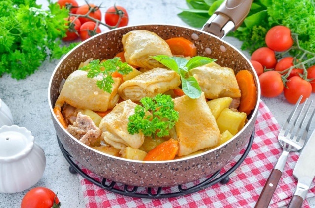 Тем временем можно заняться начинкой. Мясо моется и нарезается на большие куски, лук режется полукольцами, морковь — кружками, а картофель — кубиками. Для создания аромата овощи обжариваются вместе с мясом. Сначала мясо доводится до золотистой корочки, затем добавляются морковь, лук и картофель. После этого добавляется кипяток, томатная паста, специи и сверху раскладываются отварные рулетики теста.