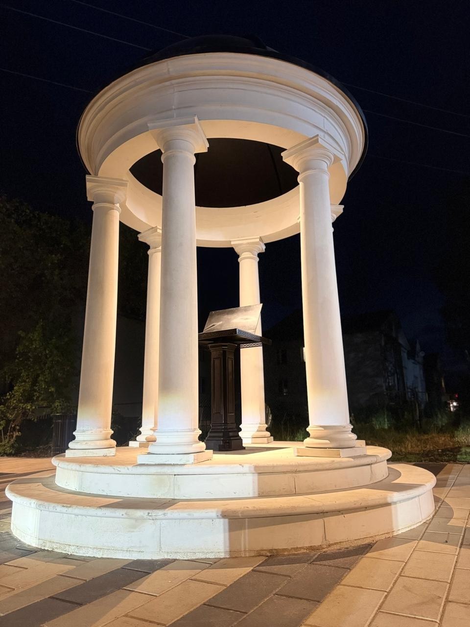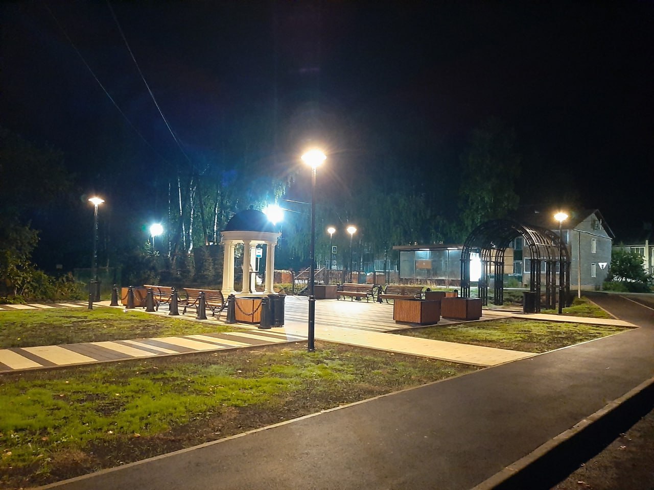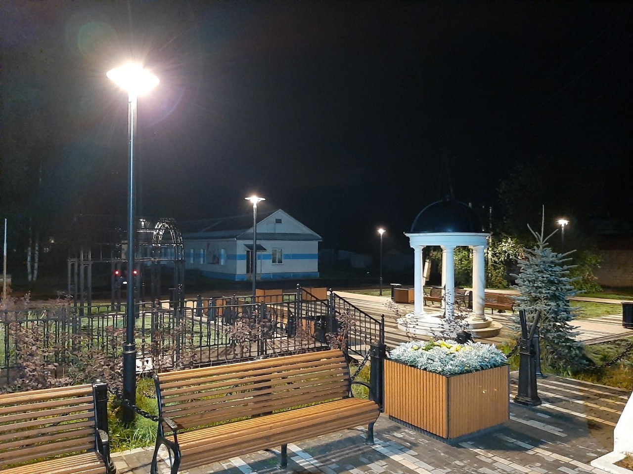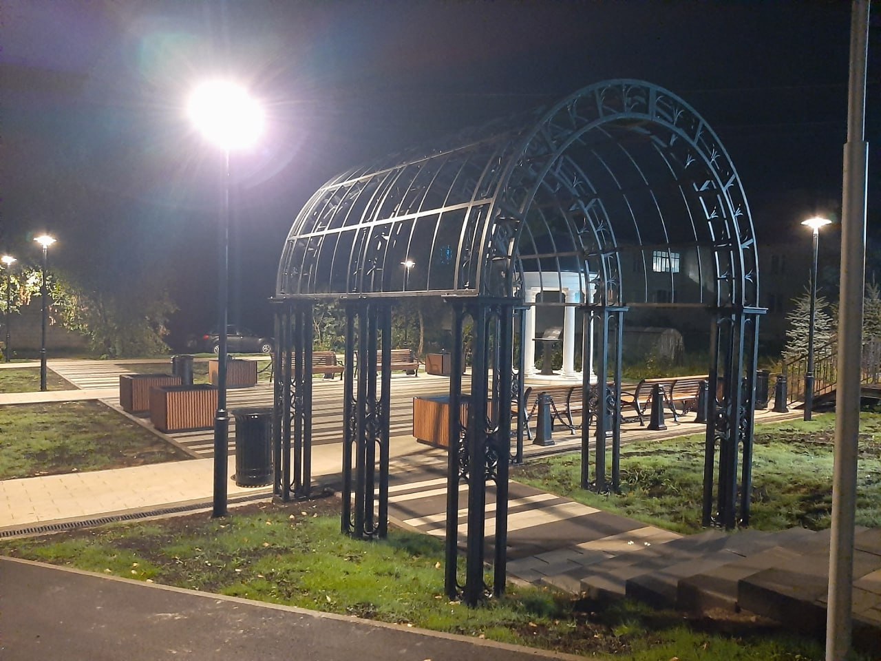 На территории появились бортовые камни, ограждение, освещение, ротонда, пергола, мостик, вазоны, урны и скамейки.