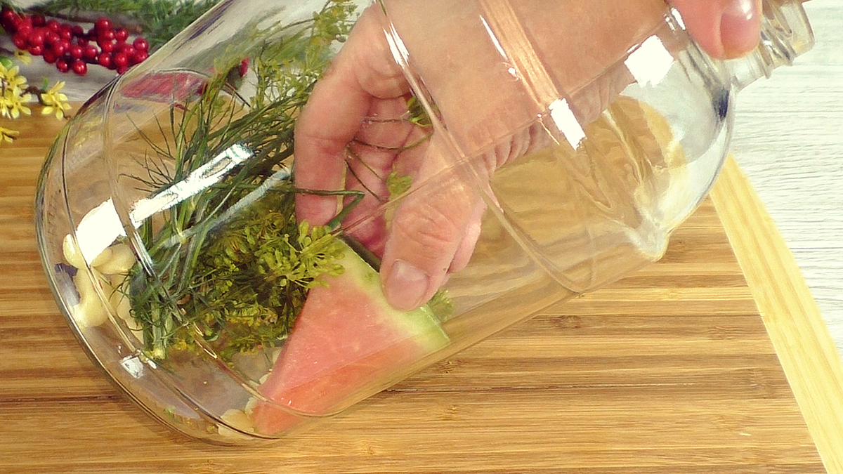 Для начала необходимы 3-литровые банки, которые следует тщательно промыть и высушить в духовке. Корки арбуза нужно нарезать на подходящие кусочки для банок. Для великолепного аромата в каждую банку добавляются зонтики укропа, немного чеснока и горошек перца.