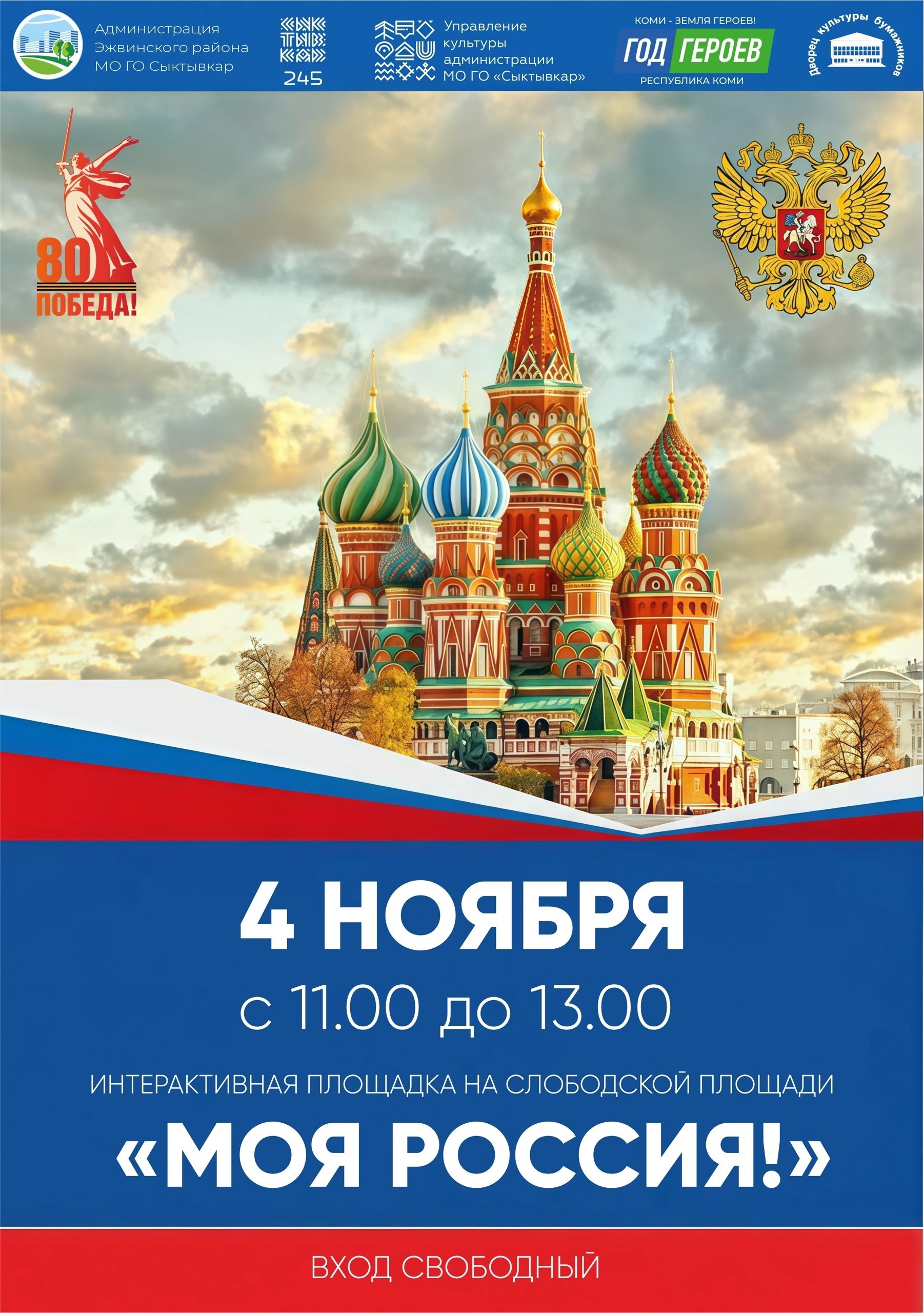 4 ноября на Слободской площади Эжвиснкого района с 11:00 до 13:00 здесь пройдет акция «Моя Россия!», организованная Эжвинским Дворцом культуры бумажников.