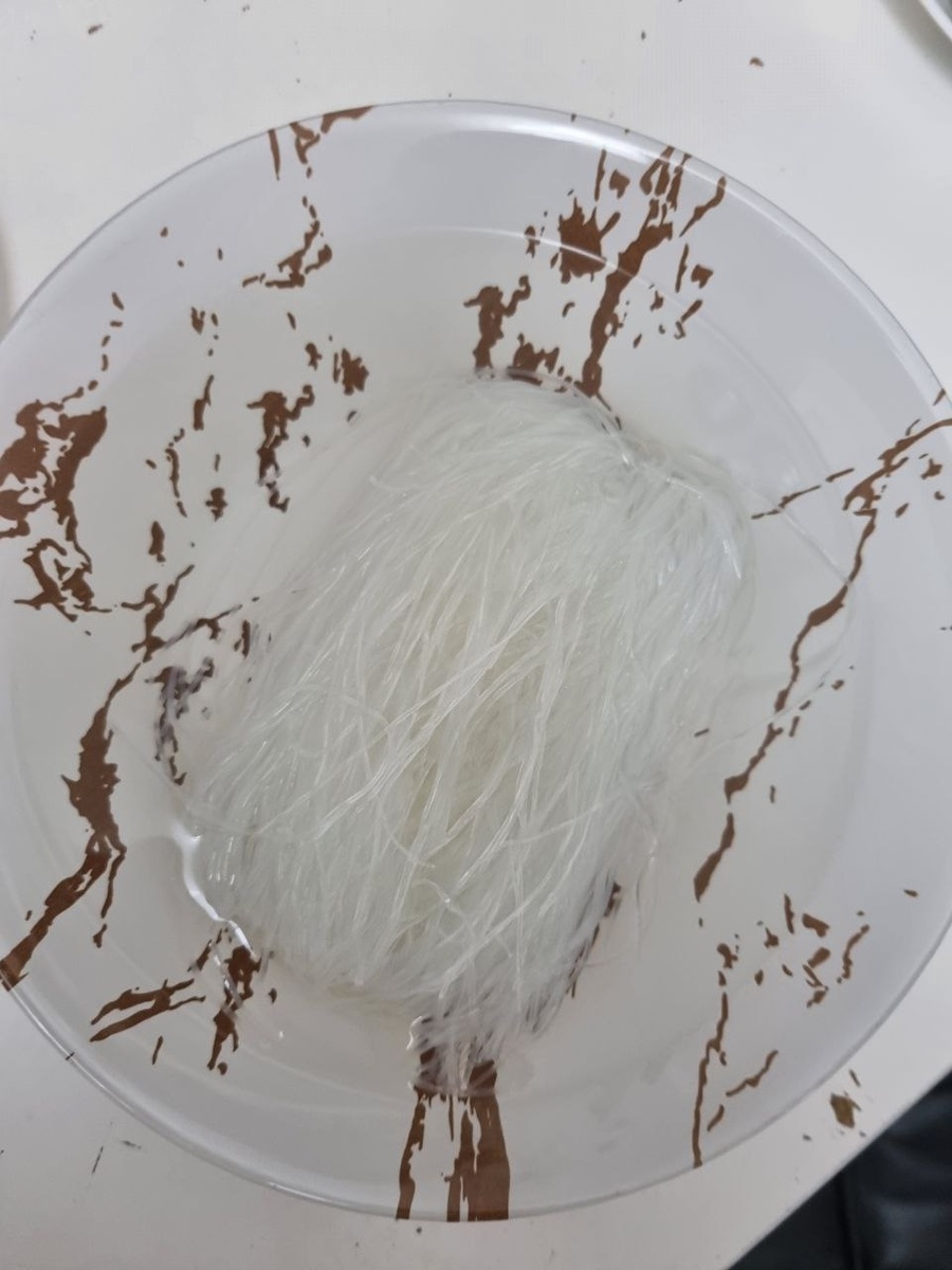 Фунчоза: Лапшу заливают кипятком и оставляют на 8 минут. Важно помнить, что варить её не нужно, иначе салат превратится в кашу. После этого лапшу откидывают на дуршлаг, не добавляя масла, чтобы не увеличивать калорийность.