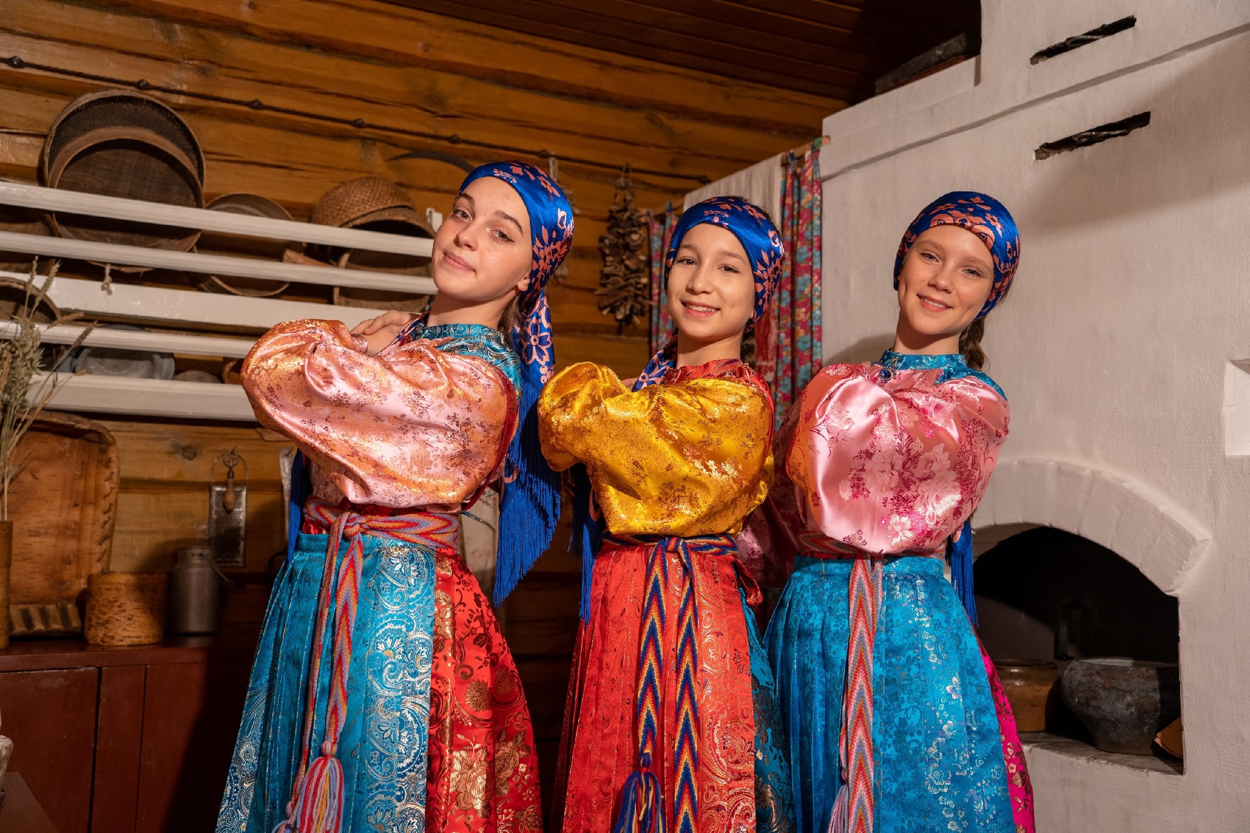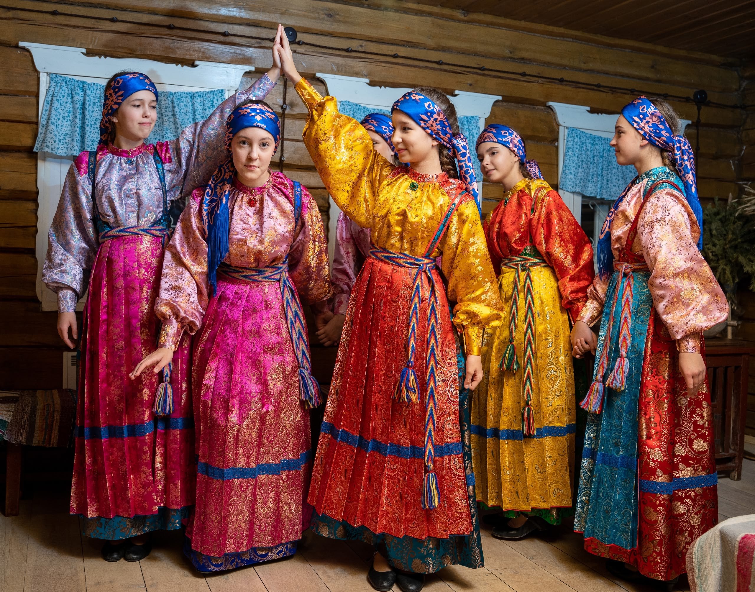 Костюмы, выполненные в традициях ижемского народа, представлены яркими рубахами, сарафанами и поясами, отличающимися разнообразием цветов: красный, желтый, зеленый, голубой и розовый. Эти элементы не только подчеркивают культурное наследие, но и придают выразительность выступлениям ансамбля.