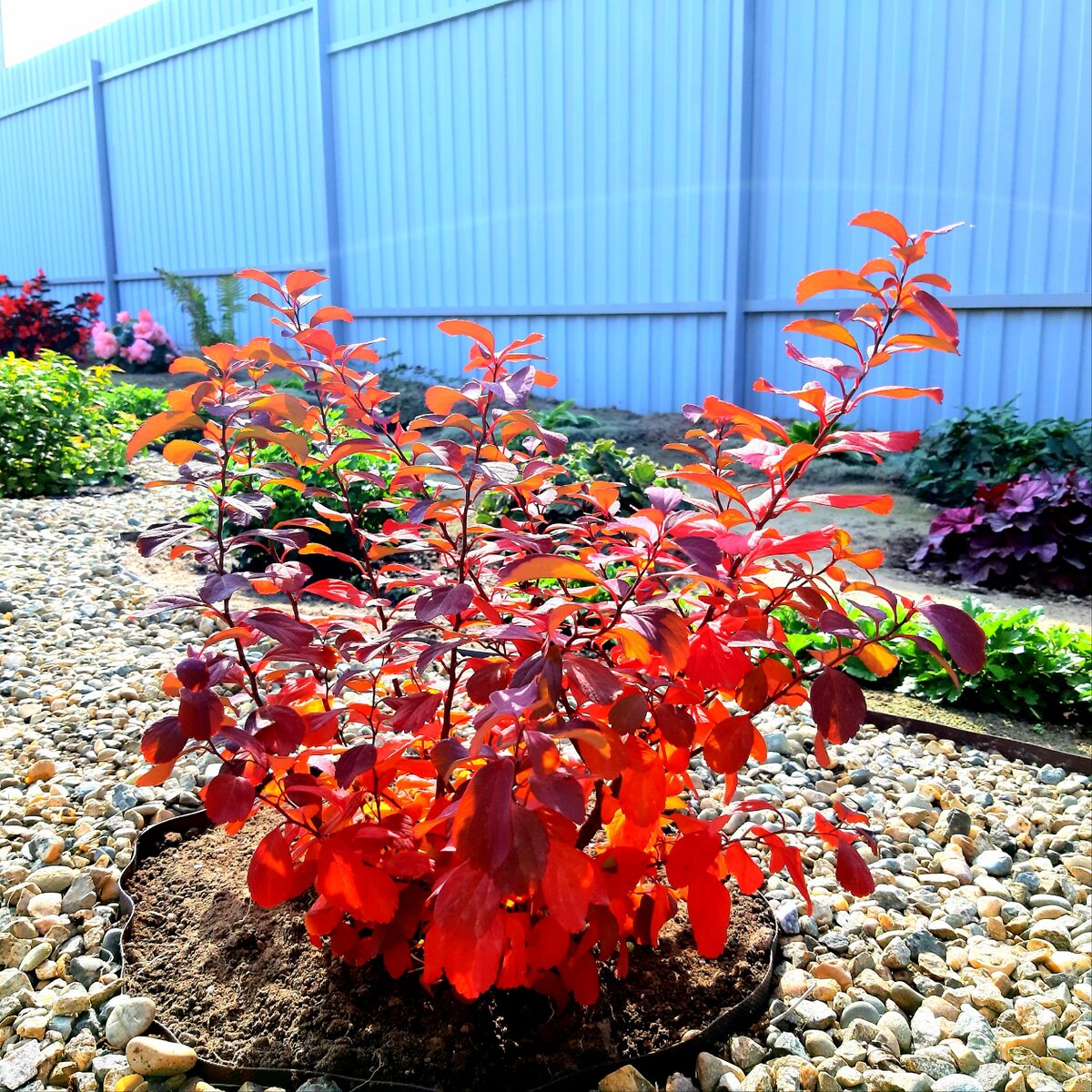 Японская спирея Голден Принцесс в свою очередь меняет свою нежно-салатовую корону на яркие золотые и оранжевые переливы, создавая светлые акценты на фоне осеннего пейзажа.