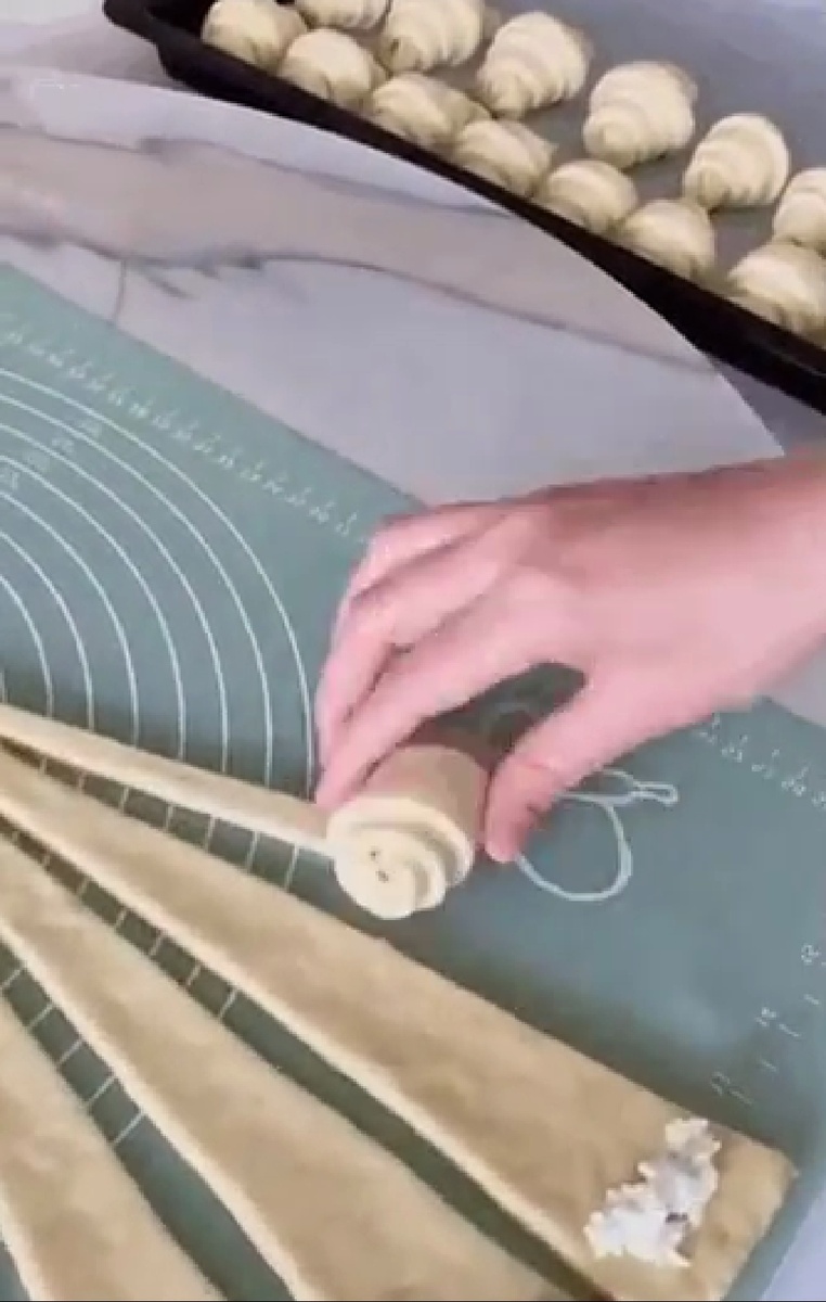 Разрежьте получившийся круг на сектора, например, на 16 треугольников. В широкую часть каждого треугольника выложите смесь сыров и сверните в рулет.