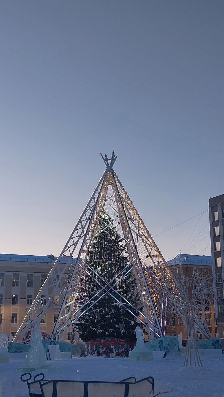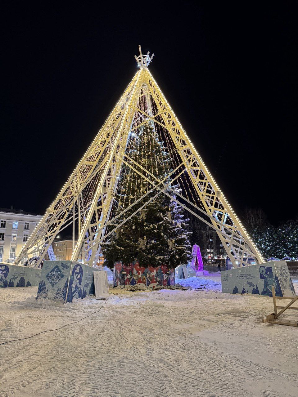 Тестовый запуск главой новогодней ели и чума-шатра над ней на Стефановской площади. Совсем скоро - 27 декабря - состоится открытие городка и светомузыкальное этно-шоу «Легенды Севера».