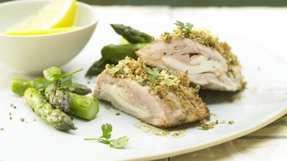 Начните с подготовки стейков: промойте и обсушите их бумажными полотенцами. Аккуратно сделайте надрез, чтобы сформировать карман для начинки.Наполните карман стейков ломтиками козьего сыра и ветчины, затем заколите отверстие зубочисткой, чтобы начинка не выпала.Измельчите свежие травы, затем натрите цедру лимона. Половину лимона отожмите, а вторую часть нарежьте дольками.Смешайте травы, хлебные крошки, 1 чайную ложку лимонной цедры и столовую ложку оливкового масла. Приправьте смесь солью и перцем по вкусу.Разогрейте сковороду с 1 столовой ложкой оливкового масла, обжарьте стейки с обеих сторон до золотистой корочки, предварительно приправив их солью и перцем.Переложите стейки в форму для запекания и посыпьте приготовленной травяной смесью. Выпекайте в предварительно разогретой духовке при 200°C на протяжении 10 минут.Пока стейки запекаются, вымойте спаржу, обрежьте у нее кончики и нарежьте на небольшие кусочки.Вскипятите бульон в сковороде, добавьте спаржу и тушите ее на сильном огне 3-4 минуты. Приправьте солью, перцем и немного лимонным соком для свежести.Подавайте фаршированные стейки с тушеной спаржей, украсив блюдо дольками лимона для визуальной привлекательности и дополнительного вкуса.Каждый кусочек этого блюда подарит гармонию вкусов и оставит незабываемое впечатление.
