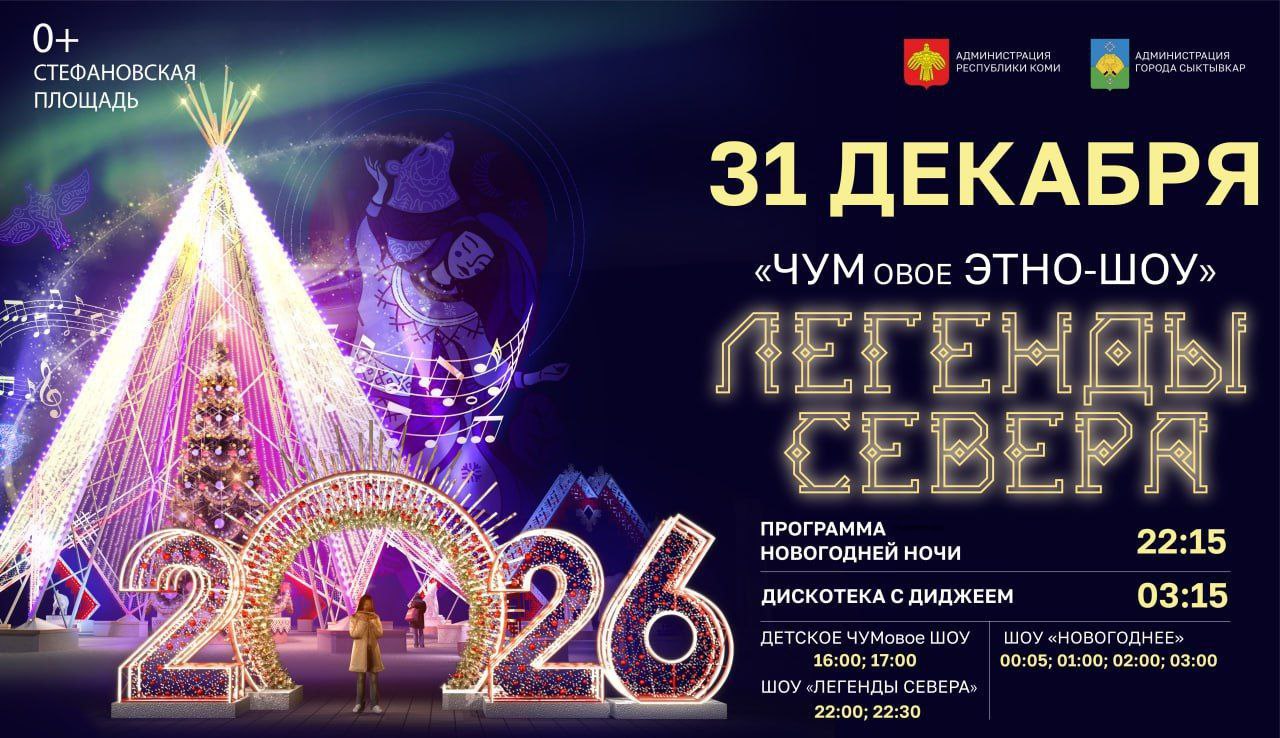1 января праздничное настроение продолжат дневные показы шоу «Детское» и «Легенды севера», концертная программа «Легенды народа коми» и новогодняя дискотека «Танцуют все!».