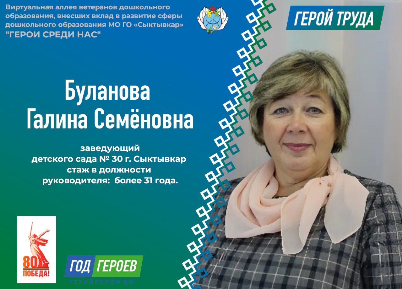 Сегодня в аллее ветеранов дошкольного образования – Буланова Галина Семёновна, человек посвятивший отрасли дошкольного образования всю свою трудовую деятельность – более 44 лет, из которых свыше 31 года руководила детским садов № 30.