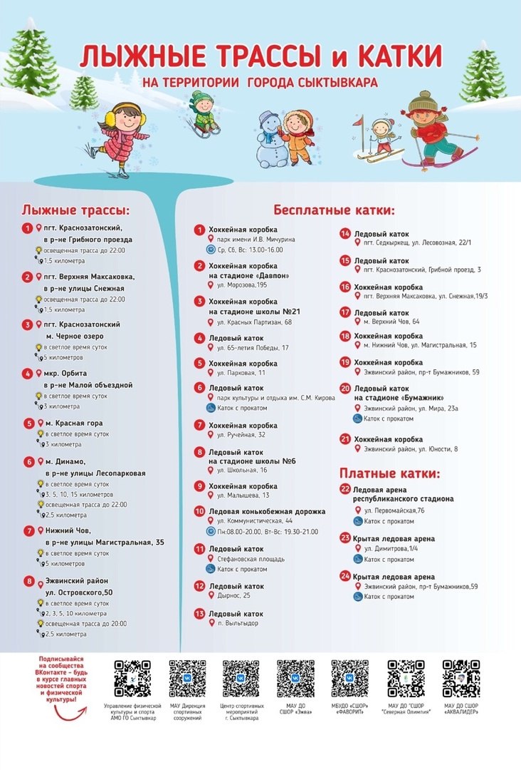 Всего в городе 21 бесплатный каток. Все они ждут вас в разных уголках Сыктывкара. Берите коньки, с семьей, друзьями и хорошим настроением - вперёд, скользить по льду. Для любителей лыж подготовлены трассы в восьми районах города. Прогулка по зимнему лесу или спортивная тренировка? Выбирайте свой маршрут и наслаждайтесь красотой северной природы.