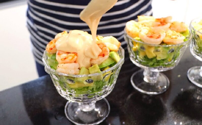 На дно порционных емкостей уложить листья салата, затем нарезанный авокадо и ананас, по желанию. Завершите салат обжаренными креветками.