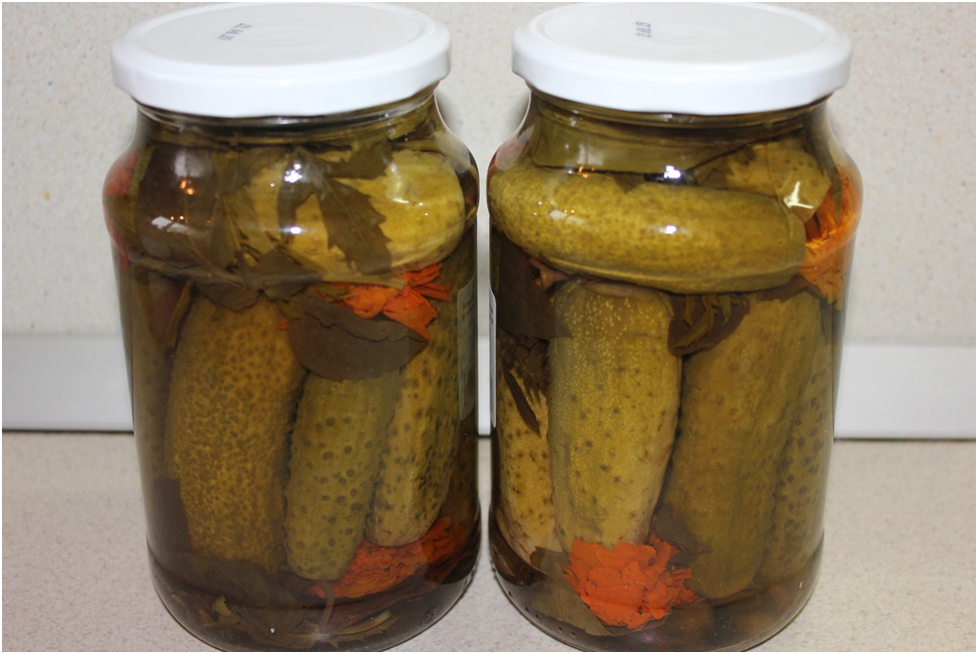 - Бархатцы — 3-4 цветка на одну литровую банку;