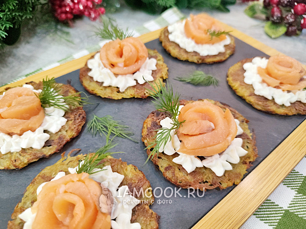 Теперь можно заняться украшением: нарежьте слабосоленый лосось тонкими ломтиками, а творожный сыр поместите в кондитерский мешок, чтобы удобно отсаживать его на остывшие драники. В центре размещайте «розочки» из рыбы и дополняйте свежеизмельченной зеленью. Простая, но эффектная закуска будет выглядеть не только красиво, но и станет настоящим украшением любого стола.