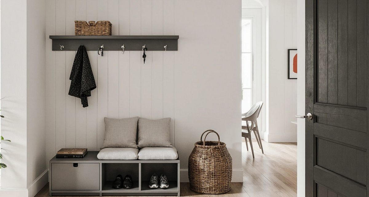 Прихожая часто становится «залежью» мелочей: ключей, перчаток, шапок и сумок. Чтобы избежать беспорядка, стоит подумать о компактной полке с крючками для ключей, органайзере для перчаток и шарфов, а также модульной обувной полке. Все это поможет не терять время на поиски и сохранять порядок.