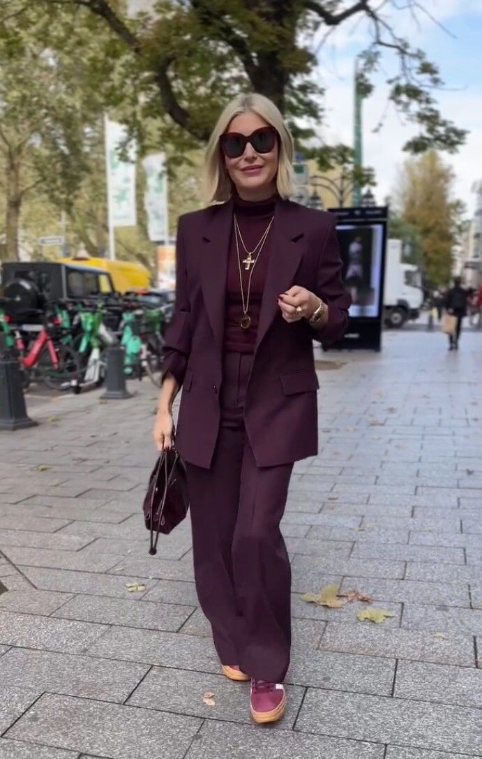 - Бордовый брючный костюм: Такой наряд – идеальный вариант для любого мероприятия, будь то деловая встреча или прогулка по городу. Комбинация удлиненного жакета и свободных брюк создаст образ, который будет выглядеть современно и стильно. Дополните его водолазкой цвета сливового вина для завершенности.
