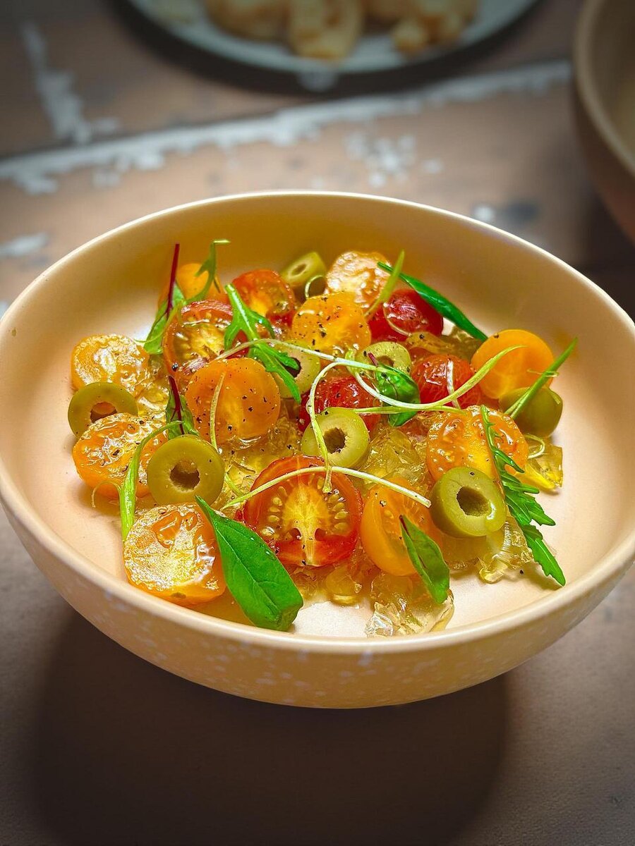 - Салат в японском стиле с овощным желе: Легкий и освежающий, сочетает в себе свежие овощи и необычное желе, что придает ему оригинальный вид и вкус.