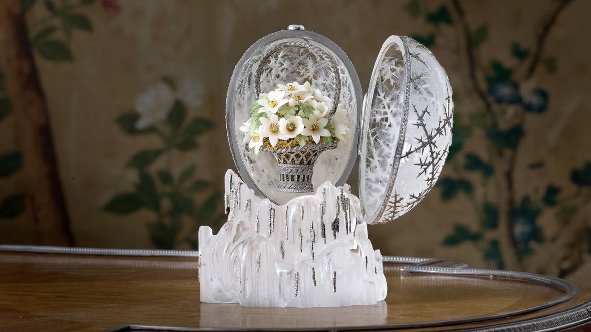 «Зимнее яйцо» было создано в 1913 году в качестве подарка для императрицы Марии Федоровны. Это поражающее изделие высотой более 10 см выполнено из хрусталя и инкрустировано около 4500 бриллиантами розовой огранки. Кроме того, его украшением служат изысканные платиновые снежинки с бриллиантами, а внутри находится миниатюрный букет анемонов из белого кварца на золотых стеблях, символ традиционных «сюрпризов» императорских яиц.