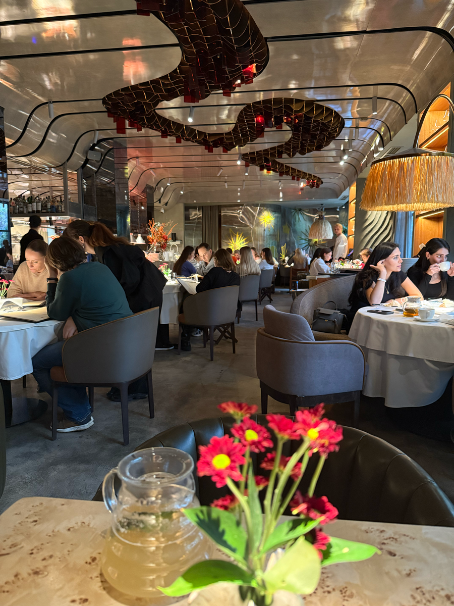 В ресторане царит волшебная атмосфера, созданная в чёрно-золотых оттенках с непревзойдённой люстрой в виде дракона. Каждый элемент интерьера будто переносит посетителей в сказочный мир, где всё кажется возможным.