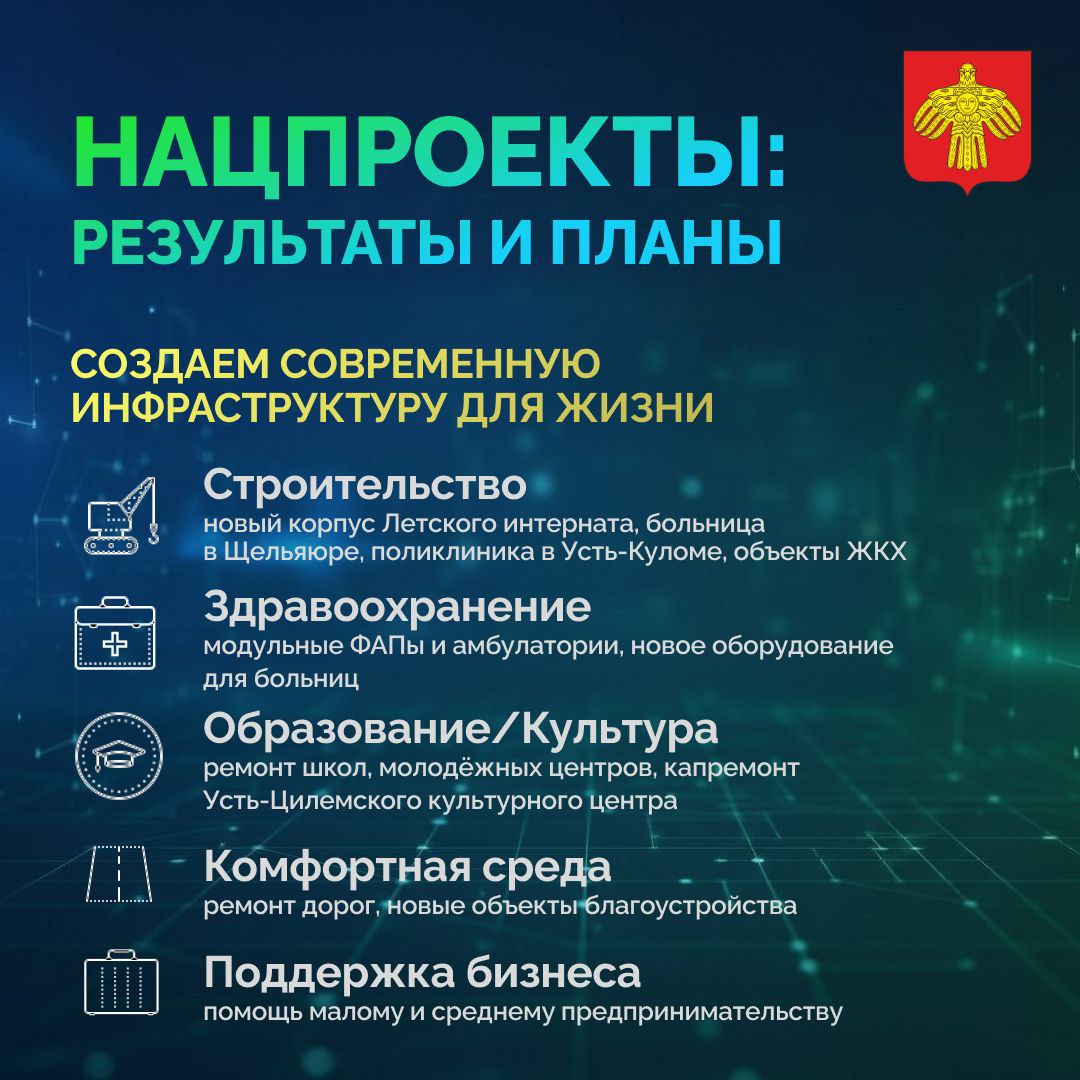 Строительство и завершение объектов: новый корпус Летского интерната, больница в Щельяюре, поликлиника в Усть-Куломе, объекты ЖКХ в Краснозатонском и Печоре.