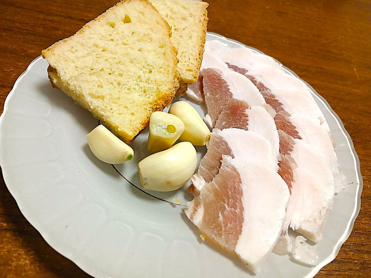 Сначала выбирают сало порезанное на удобные кусочки. Слоёв чеснока, сала и пряностей достаточно, чтобы получить равномерный вкус и сохранить текстуру.
