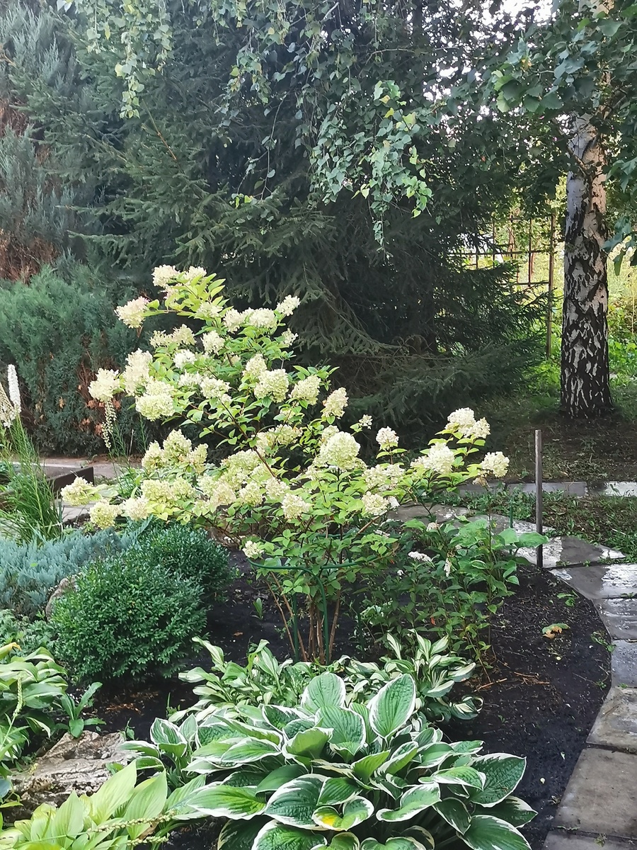 Определившись с местом для клумбы, которое освободилось после гибели абрикоса, было решено использовать уже существующие растения. В основу клумбы легли гортензии, самшиты и туи, которые стали отправной точкой для будущего цветника. Участок оказался окружен дорожками и виноградной шпалерой — отличными рамками для нового зеленого уголка.