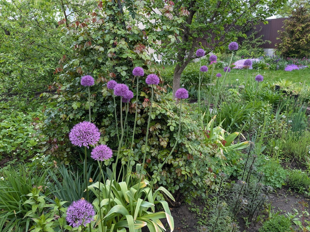 На фоне чудесных ковриков шиловидных флоксов великолепно смотрятся цветы лука Суворова. Хотя эти растения не были посажены вместе, их соседство создает удивительный визуальный эффект. Рекомендуется подумать о небольшой скамейке, чтобы наслаждаться этой красотой с разных ракурсов.
