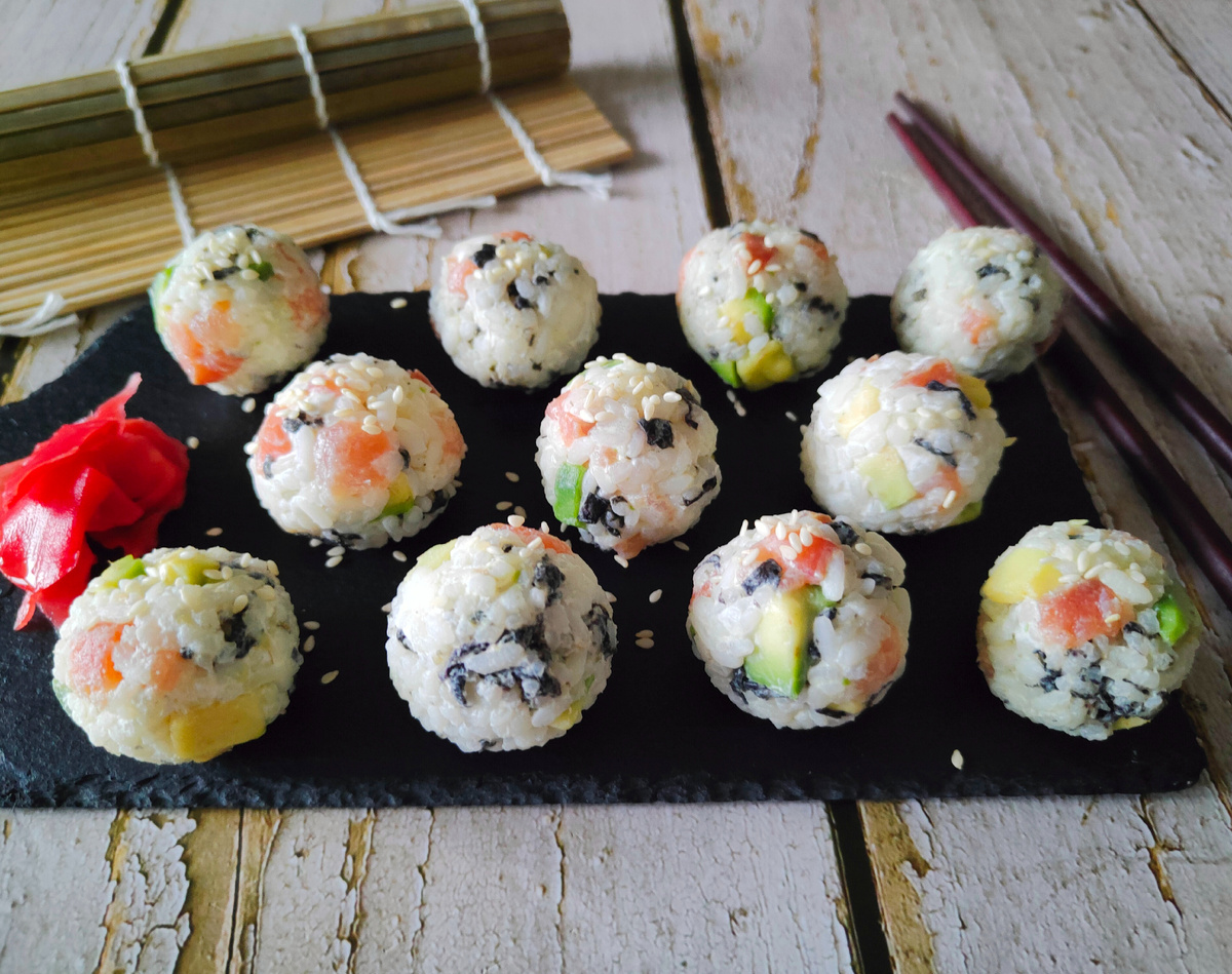 Нори измельчается ножницами и добавляется в рис. Перемешивание лучше всего производить палочкой, чтобы ингредиенты не потеряли свою форму. Добавляются рыба и авокадо, а затем сливочный сыр — примерно две столовые ложки на два стакана риса. Все вновь перемешивается, и влажными руками формируются «фрикадельки» размером с грецкий орех. Перед подачей тарелка с закуской также накрывается плёнкой для охлаждения.