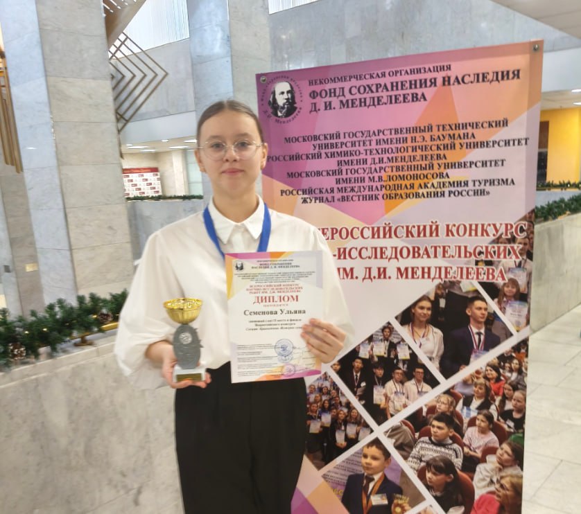 Ульяна Семенова , ученица Воркутинской школы 14, удостоилась второго места на XXII Всероссийском конкурсе имени Д. И. Менделеева, который недавно завершился в Москве.